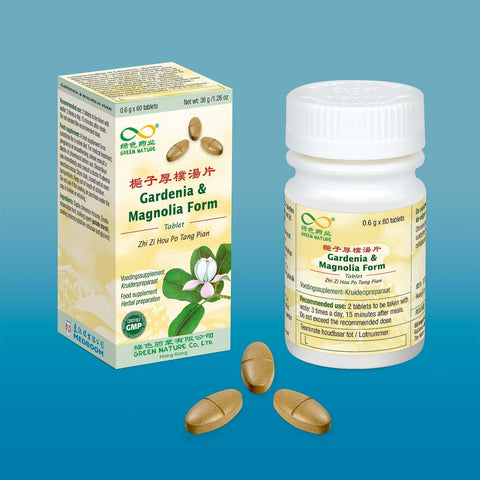 Gardenia jasminoides fruit, Magnolia officinalis bark, Citrus aurantium unripe fruit, Bulking Agent (Potato starch&Magnesium stearate), coating (microcrystalline cellulose and glycerol).
